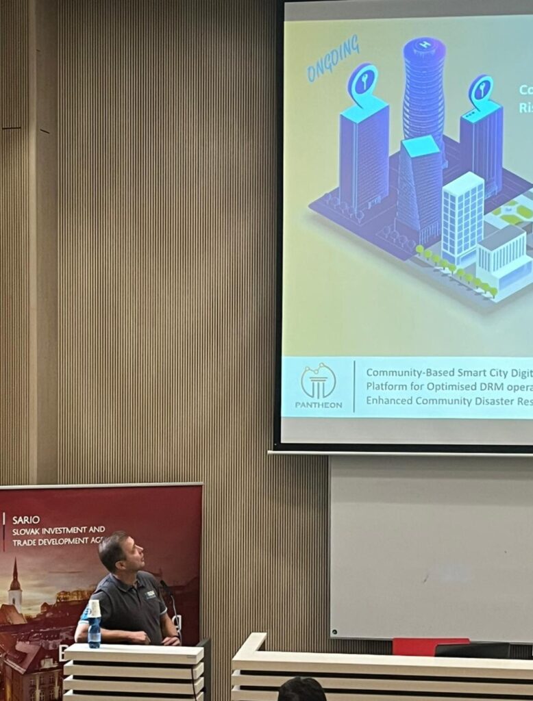 One of these efforts, the Satellite-based Services for Disaster Risk Management event, occurred in Slovakia. The Faculty of Informatics and Information Technology of the Slovak University of Technology in Bratislava hosted it on the 30th of November, 2023. There, our partner, the International Security and Emergency Management Institute (ISEMI), took part in the event with Martin Kostolný, the Head of the Office. Part of his presentation was to introduce our PANTHEON project and, more specifically, our mission to enhance CB-SCDT processes and establish optimal Disaster Risk Management operations by implementing satellite data, smart city IoT, insitu, community-generated data and AI technologies.