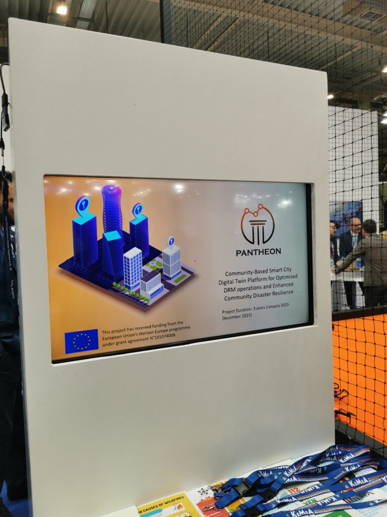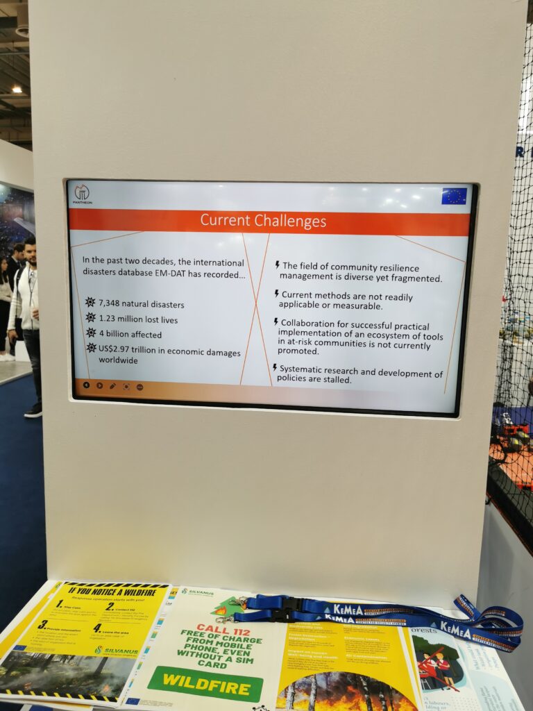 For the first time, the PANTHEON project had the opportunity to spread the word about its mission to build robust infrastructure for optimising Disaster Risk Management operations and strengthening Community Disaster Resilience. During the three-day International Defence Exhibition Athens 2023 (DEFEA) (May 9-11), the PANTHEON project was presented at the exhibition stand of our project partner, the Center for Security Studies (KEMEA). One of the screens at the stand was dedicated to PANTHEON, showing a short presentation of the current challenges in Disaster Resilience, the project technologies, its overall mission, as well as the extensive consortium.
